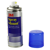 3M SprayMount Spray Adhesive Repositionable. Easily repositioned up to 12 hours later. Ideal for mock ups, mounting designs, theatre sets, prototyping, exhibition boards and lightweight materials. Clear and non-staining. includes 1 x 200ml spray can.