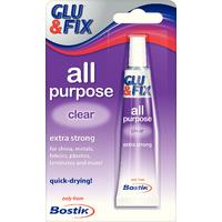 Bostik all purpose clear glue with extra strong, quick drying clear adhesive. Sticks a variety of household materials including porcelain, wood, fabric and card. Ideal for general household repairs and craft uses. 20ml.